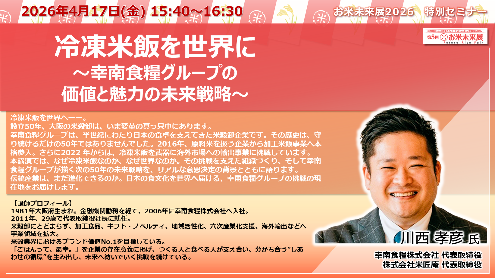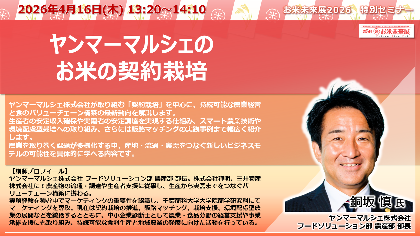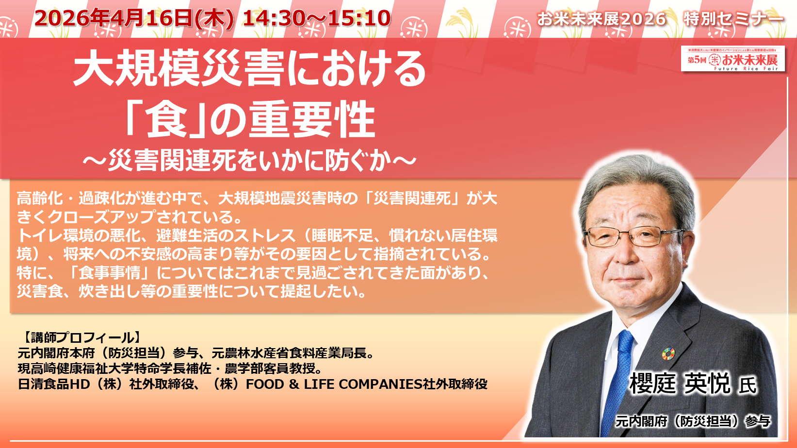 ◆「お米未来展展 特別セミナー」の講演内容と講師プロフィールをご紹介いたします◆