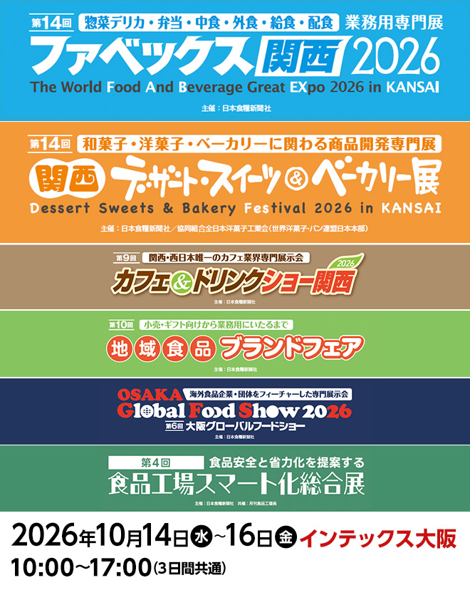 関西ファベックス展、関西デザート・スイーツ&ベーカリー展、カフェ&ドリンクショー、地域食品ブランドフェア、フードテック関西の特長についてご紹介します。