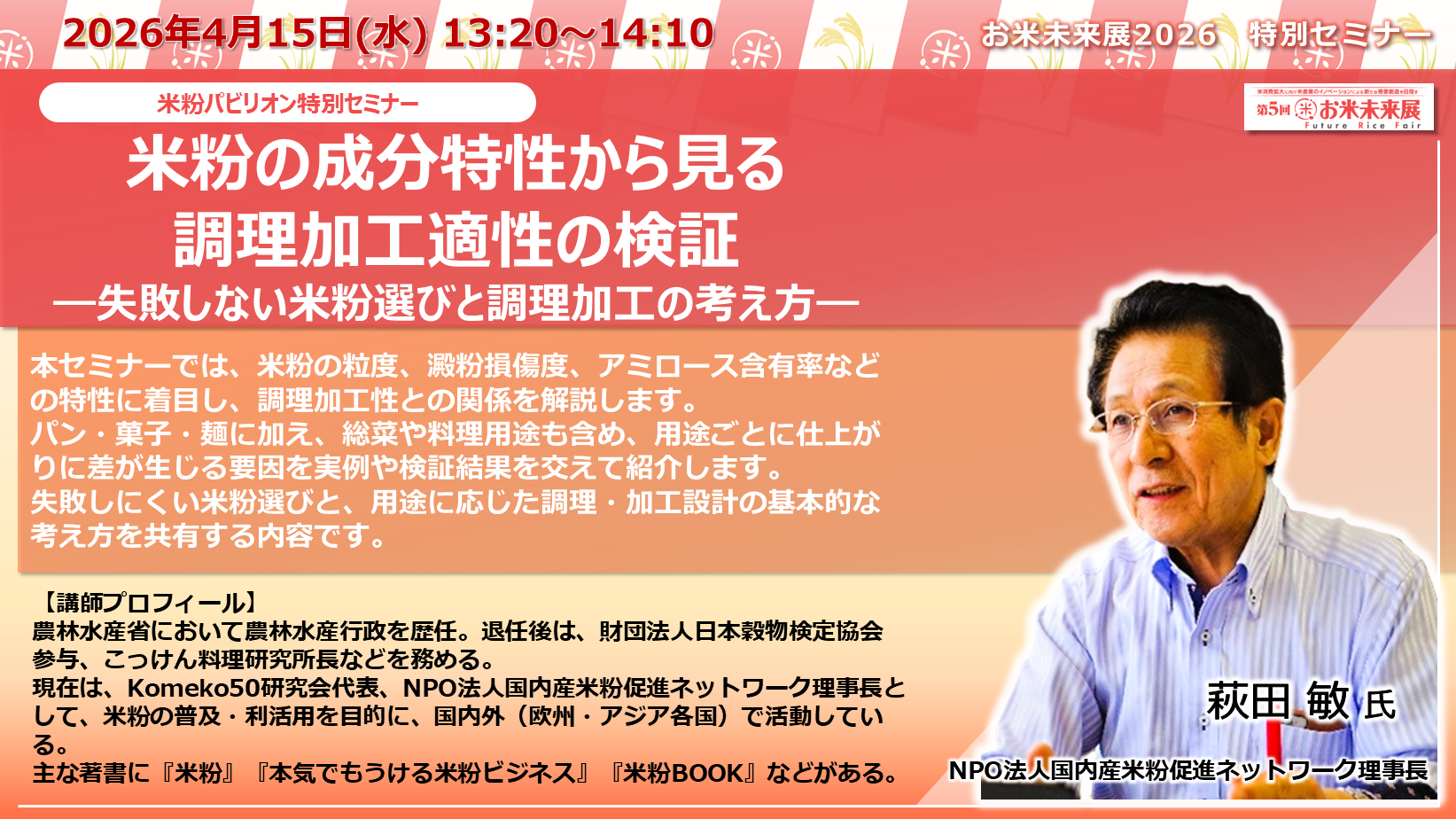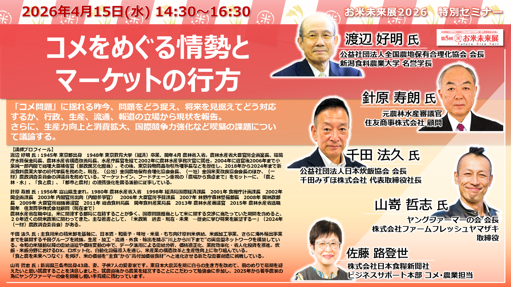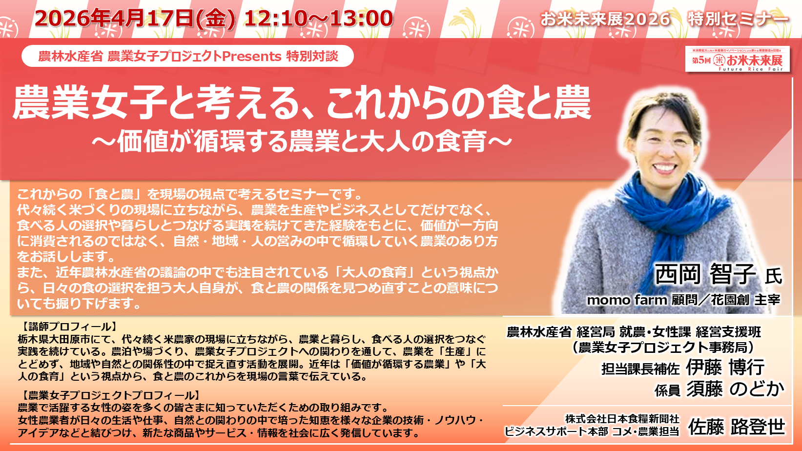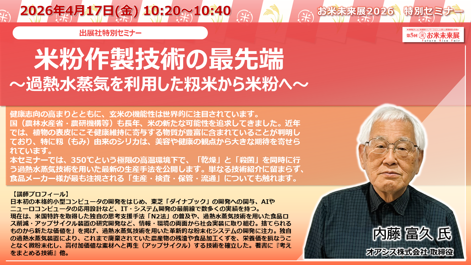 ◆「お米未来展展 特別セミナー」の講演内容と講師プロフィールをご紹介いたします◆